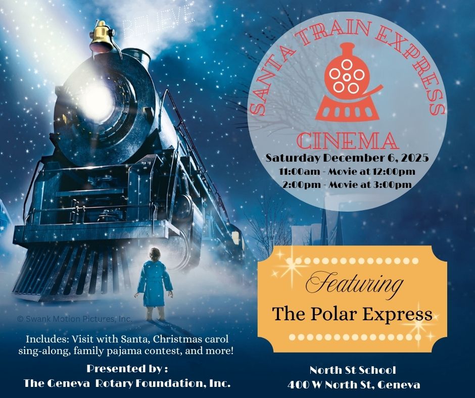 Join the Geneva Rotary Club for a magical afternoon of holiday fun on Saturday, December 6, at North Street School ( 400 W North Street, Geneva, NY). Family and friends are invited to experience the timeless holiday favorite The Polar Express on the big screen – but the magic begins before the movie with a special visit from Santa himself! Tickets can be purchased here.